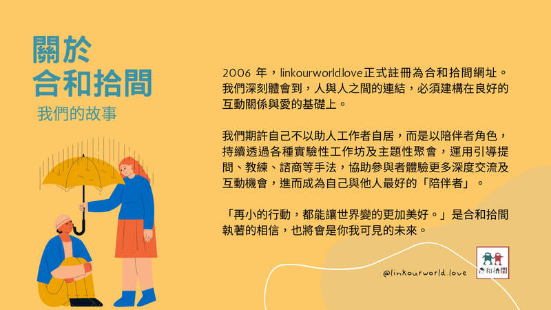 - 授課目標:學習如何陪伴他人,了解自己選合陪伴的族群以及陪伴他人需要具備的能力和注意事項。