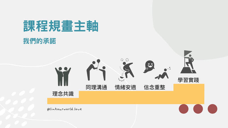 - 以「同理溝通/情緒安適/信念重整」三大單元為核心貫穿初階、中階、高階課程,由淺入深,養成陪伴所需具備的相關認知及能力。