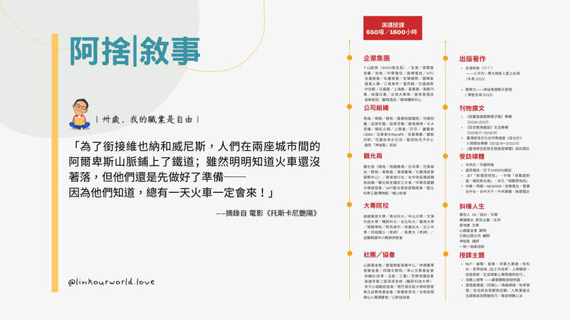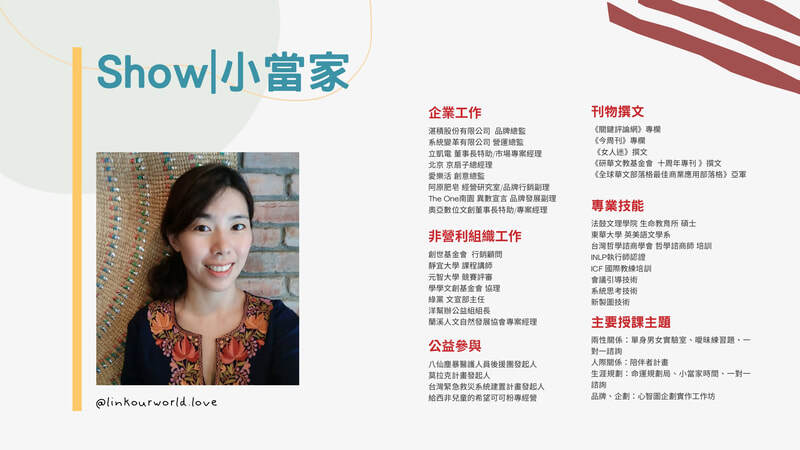 - 職場進修:心智圖、品牌行銷、創業計畫書撰寫、會議引導、系統思考