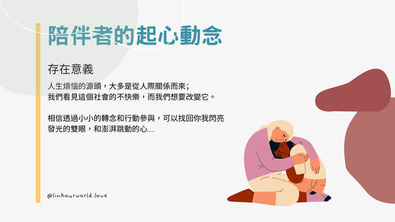 - 授課目標:學習如何陪伴他人,了解自己選合陪伴的族群以及陪伴他人需要具備的能力和注意事項。