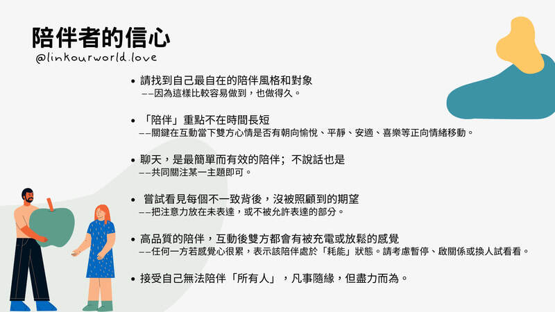 - 授課目標:學習何謂有效的陪伴,了解陪伴者定位和認知。