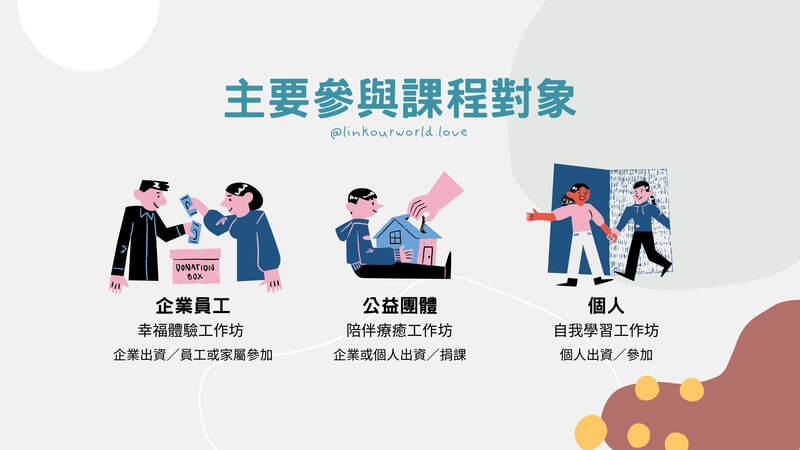 - 協助參與者在過程中學習、成長,找到志同道合的心靈伙伴